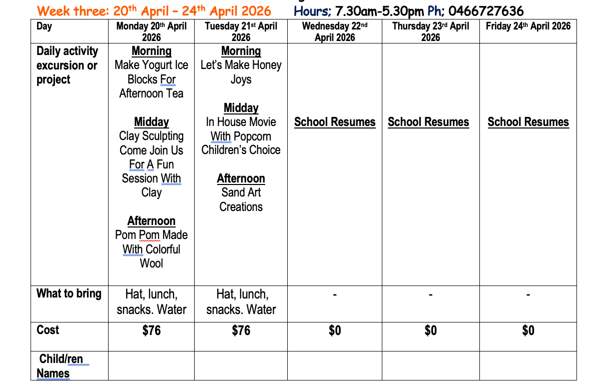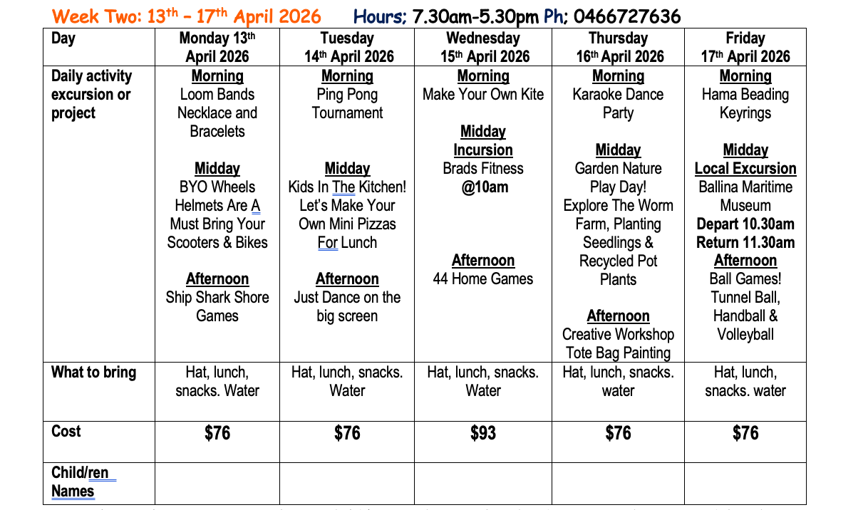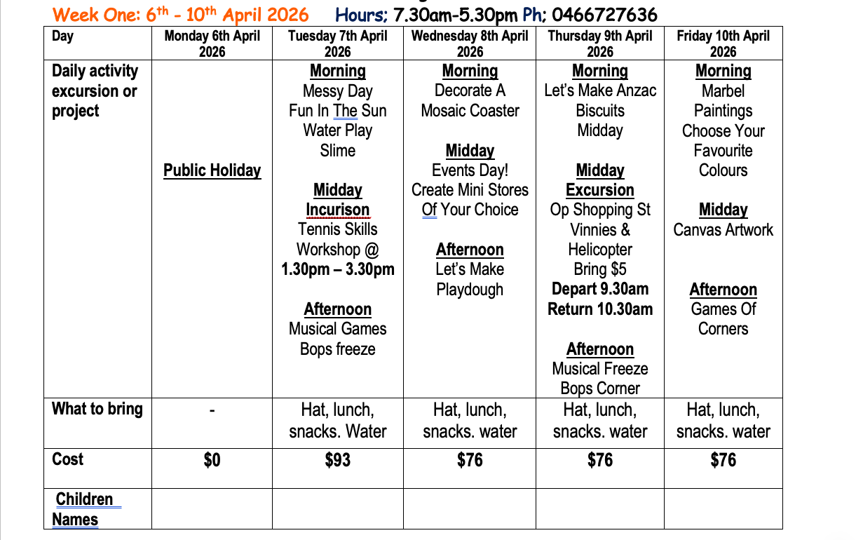 We provide vacation care for children aged 5–12 years. Children must have completed at least one full term of school before enrolling in the program.