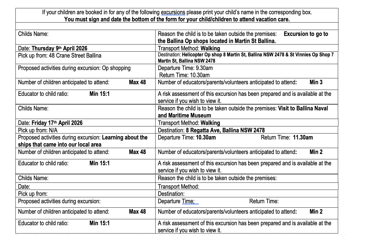 View the planned excursions for the term. By enrolling your child or children for the selected attendance dates above, you give permission for them to participate in these activities.